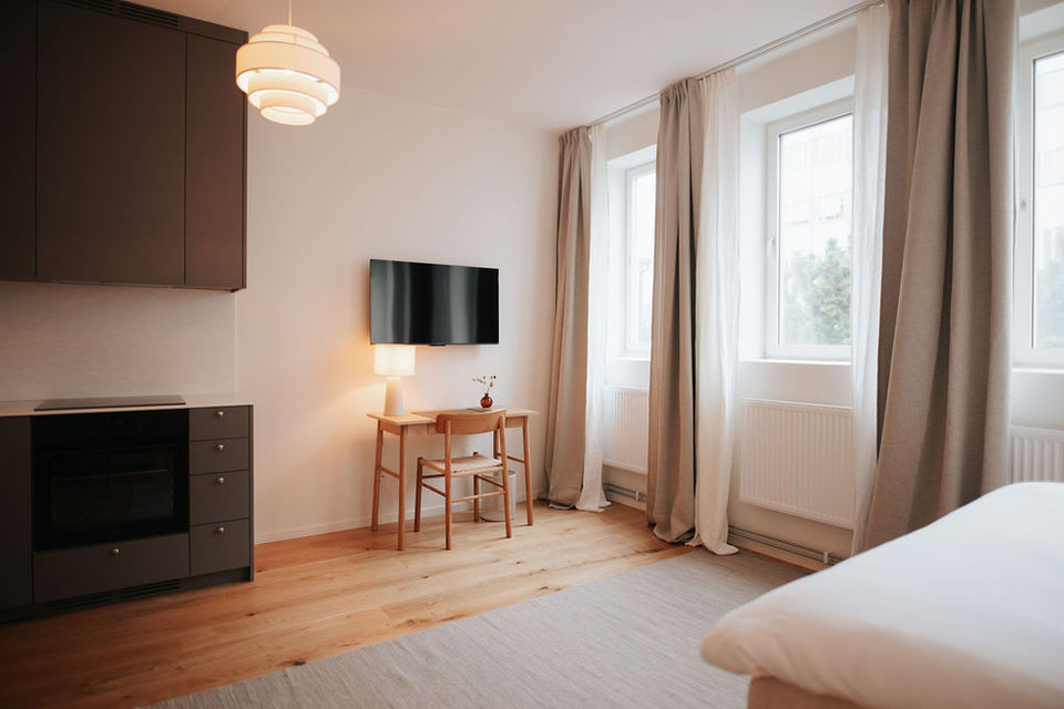 The hotel features 28 fully equipped apartments, perfect for both short and long stays. Each apartment has been thoughtfully renovated to provide everything you need for a comfortable stay. Choose from our cozy Queen studios, spacious Deluxe and Superior studios, or opt for a One-bedroom apartment if you need extra space.
